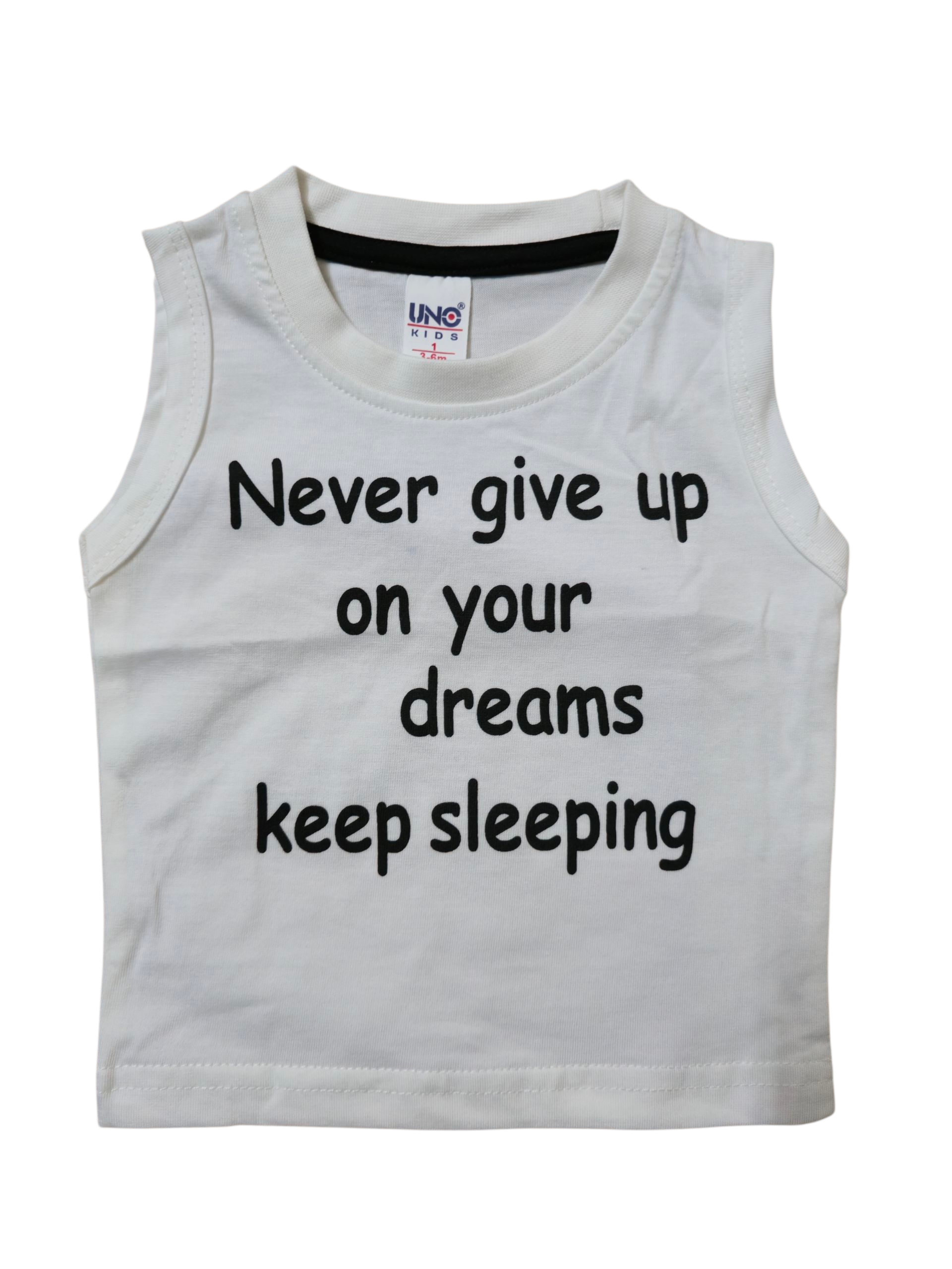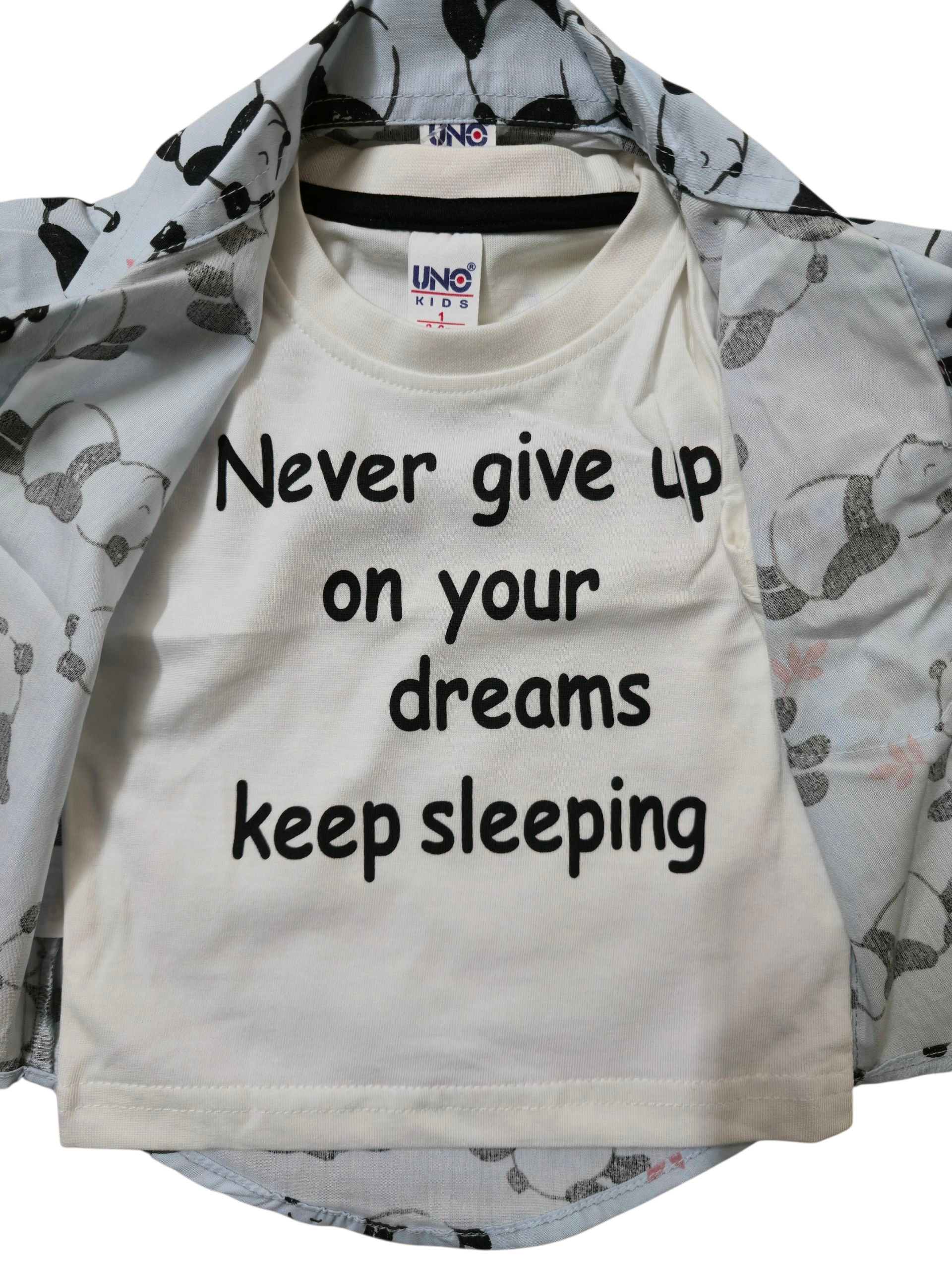 This UNO Kids outfit features a playful panda print, perfect for your little one's adventures! The set includes a short-sleeved, button-up shirt with a cute panda design, a matching t-shirt with the text 'Never give up on your dreams, keep sleeping', and comfortable shorts.
