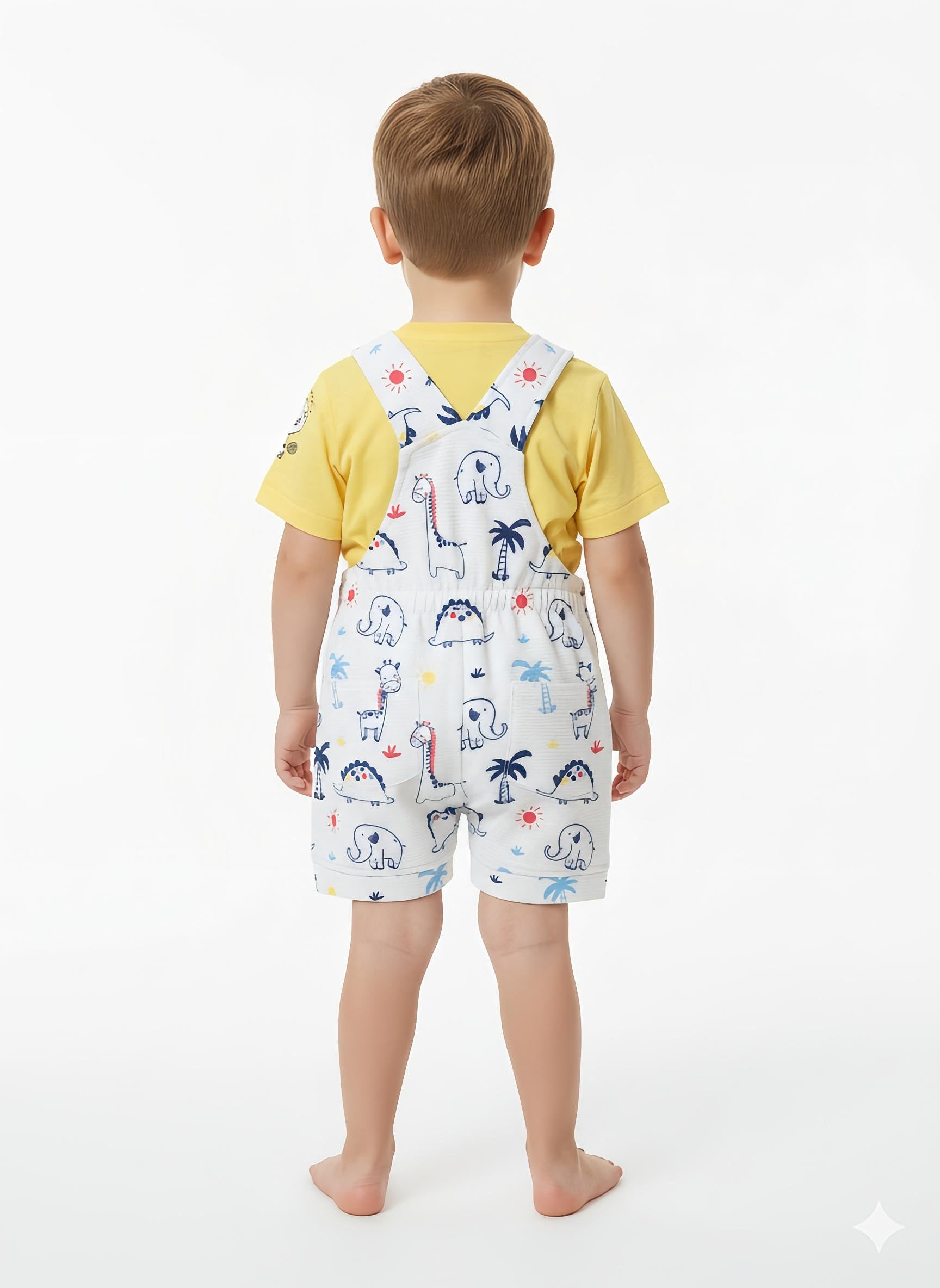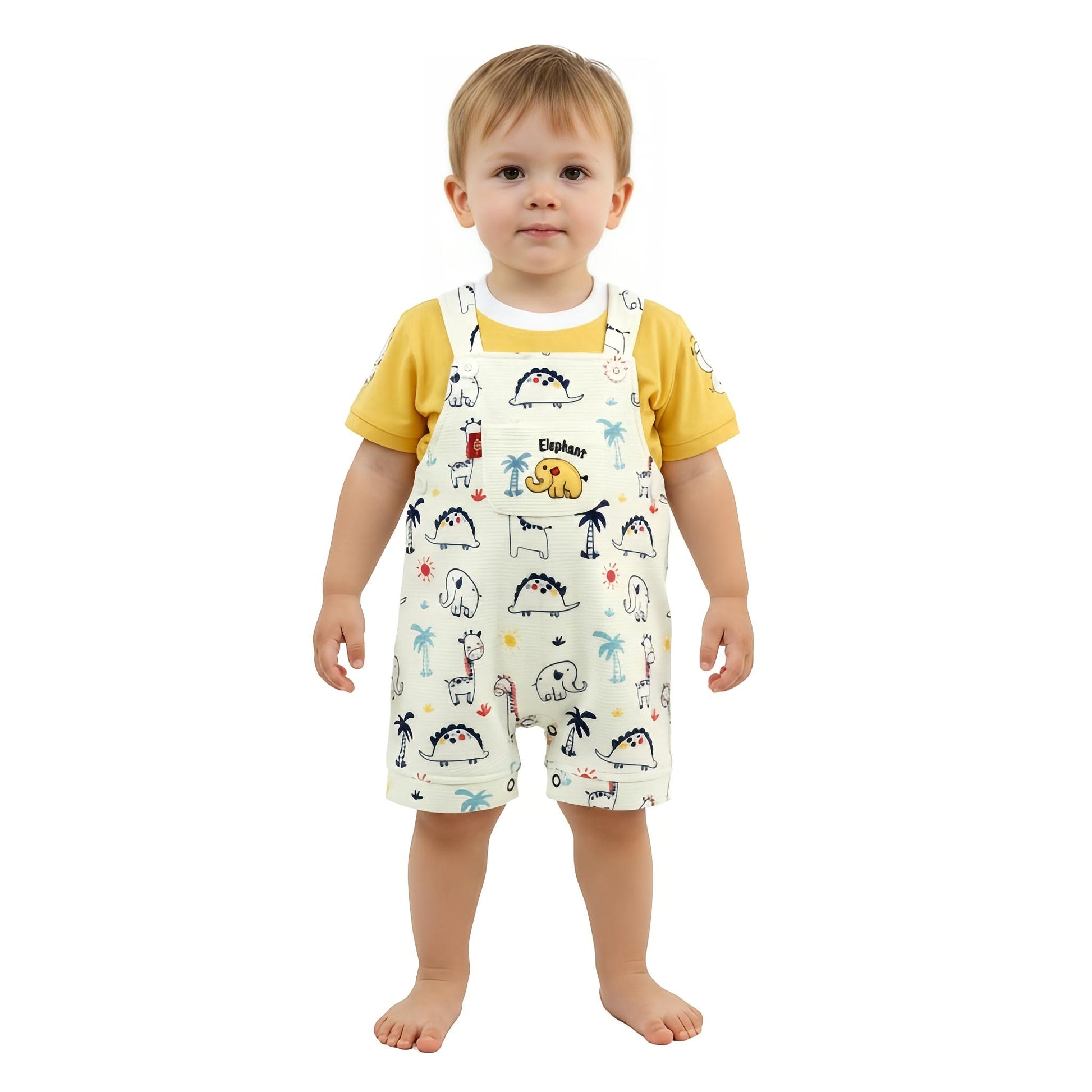 This unisex Baby Outfit features a yellow t-shirt with a suspension strap and a white animal print. Perfect for any occasion or everyday wear, this set offers both style and versatility for your little one. Stay comfortable and fashionable with this must-have baby outfit.